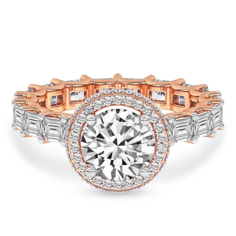 The Amaryllis Side Emerald Lab Diamond Ring crafted in 21kt rose gold is a captivating blend of classic beauty and radiant elegance. A stunning center diamond is set in a timeless 4-round prong setting, encircled by a brilliant halo of accent diamonds in a plate prong setting. This halo is designed to be visible from both the top and side view, offering a mesmerizing sparkle from every angle. The shank is adorned with a full eternity spread of diamonds, set in exquisite "U" prongs, ensuring a seamless, continuous shine around the finger. This engagement ring embodies the ultimate symbol of love, making it a timeless choice for a lifetime commitment. You can pair this ring with a complementary matching band, enhancing the stunning, full-circle sparkle for an unforgettable set.