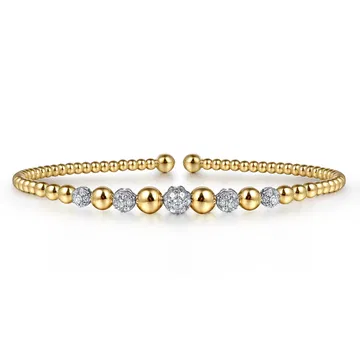 Radiate sophistication with this 21K Yellow-White Gold Bujukan Diamond Stations Bangle, featuring alternating gold tones and brilliant diamond stations. Meticulously handcrafted with signature Bujukan bead detailing, this exquisite bangle embodies timeless luxury and refined elegance — perfect for any occasion.