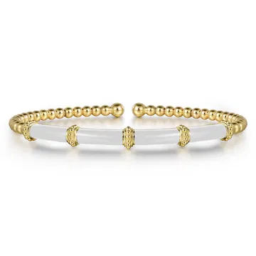 Add a touch of modern elegance with this Bujukan Bar Bangle in 21K Yellow Gold and White Enamel. Featuring a sleek split design accented with polished Bujukan beads and smooth white enamel detailing, this bracelet blends timeless craftsmanship with contemporary sophistication — perfect for any occasion.