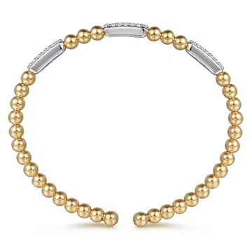 Experience timeless elegance with this Luxury 21K Gold Diamond Pave Split Bangle, crafted in stunning white and yellow gold. Designed with intricate Bujukan bead detailing and sparkling pave-set diamonds, this two-tone bracelet embodies sophistication and modern luxury.