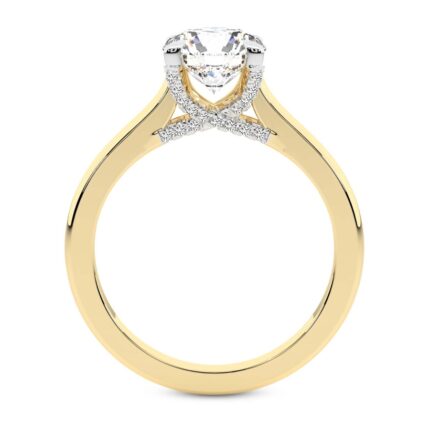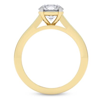 The 21kt yellow gold Azalea solitaire 1.5mm lab diamond ring is designed to capture hearts with its fascinating features. The shank extends gracefully to the center stone amid four claw prongs, creating a stunning 'U' shaped bridge that adds a touch of uniqueness to the design. The dome shank adds a subtle elegance, making this ring truly remarkable.