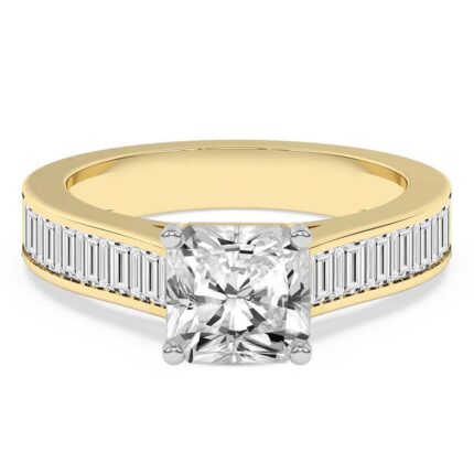 The Irene Side Stone Lab Diamond Ring 14kt yellow gold radiates understated luxury, the center stone held in a four-prong setting, complemented by straight baguette side stones in a modern channel setting. Its cathedral shank, visible from the front, enhances the design, while the 50% diamond spread and tapering flat band create a harmonious flow of brilliance and elegance. This high-end piece exudes both sophistication and timeless beauty.