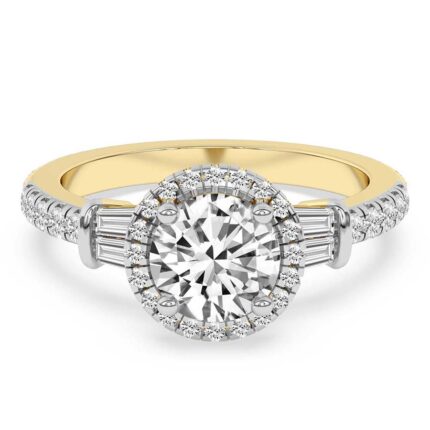 The Liora Cascade Halo Lab Diamond Ring in 14kt yellow gold exudes timeless elegance, featuring a center stone secured in a classic four-prong setting, surrounded by a dazzling diamond halo. Two tapered baguettes, totaling 0.60 carat, are set in sleek bar settings, further elevating the ring’s brilliance. The shank is adorned with prong set diamonds, creating a seamless 50% diamond spread. The straight, flat band and visible gallery enhance the sophisticated design, offering beauty from every angle. This stunning piece is a perfect choice for those who seek elegance and grace in every detail.