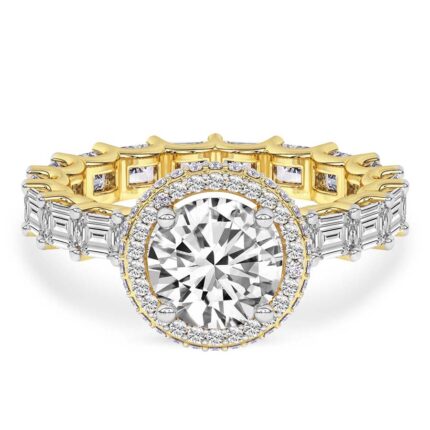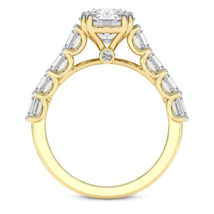 Timeless yet modern, the Enchanted Bliss Side Stone Lab Diamond Ring in 21kt yellow gold is a captivating blend of elegance and charm. The four-claw prong setting holds the brilliant center stone, enhanced by a hidden halo for subtle radiance. A bezel-set diamond, visible from the front, adds a unique touch. The dome straight shank features a mix of baguette and round diamonds, baguettes in sleek bar settings and rounds in both channel and prong setting, offering a dynamic play of light. With a 50% diamond spread, this ring is a refined choice for the modern romantic. Pair it with a contoured wedding band for a perfectly seamless bridal look.